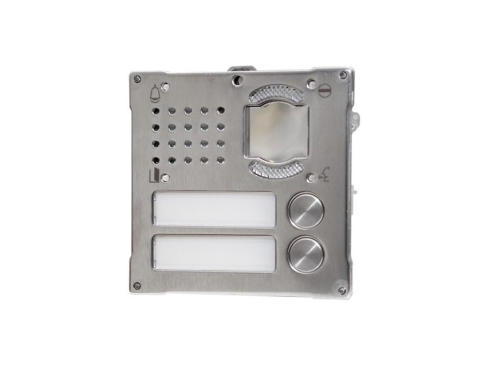 Predný modul pre systém Comelit Vandalcom, 2 tlačítka, výrez pre kameru. Rozmer 106 x 106 x 44 mm, pre použitie s audio/video jednotkou v závislosti od použitého systému zapojenia. Materiál nehrdzavejúca oceľ.