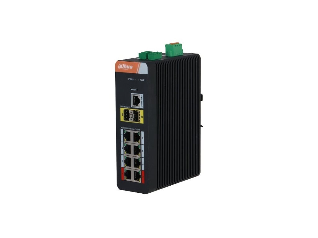 Dahua priemyselný switch 8x 1000 Mbps + 2x SFP Gbit + 1x konzola port, podpora PoE pre 8 portov, 2x PoE++ (90 W) + 6x PoE (IEEE802.3at), celkovo na všetky porty max. 120 W, manažment, podpora STP / RSTP / MSTP, ochrana pred prepätím 4 kV, napájanie 48–53 V DC (zdroj nie je súčasťou balenia), montáž DIN-Rail, pracovná teplota od -40 °C do +75 °C, rozmery 125,0 × 53,5 × 175,0 mm, hmotnosť 1,25 kg. Switch nie je vhodný pre Avigilon kamery.
