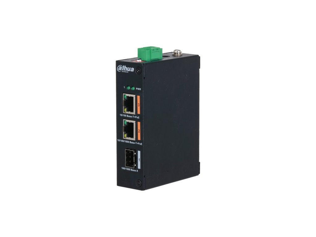 2portový switch Dahua, 1x 10/100 Mbps PoE port, 1x 10/100/1000 Mbps PoE port, 1x 100/1000 Mbps SFP, DC 48–57 V, podpora Hi-PoE 60 W, IEEE802.3af, IEEE802.3at, maximálny odber celkom 60 W, bez manažmentu, pracovná teplota od -30 °C do +60 °C, zdroj je súčasťou balenia, rozmery 105 x 75 x 30 mm