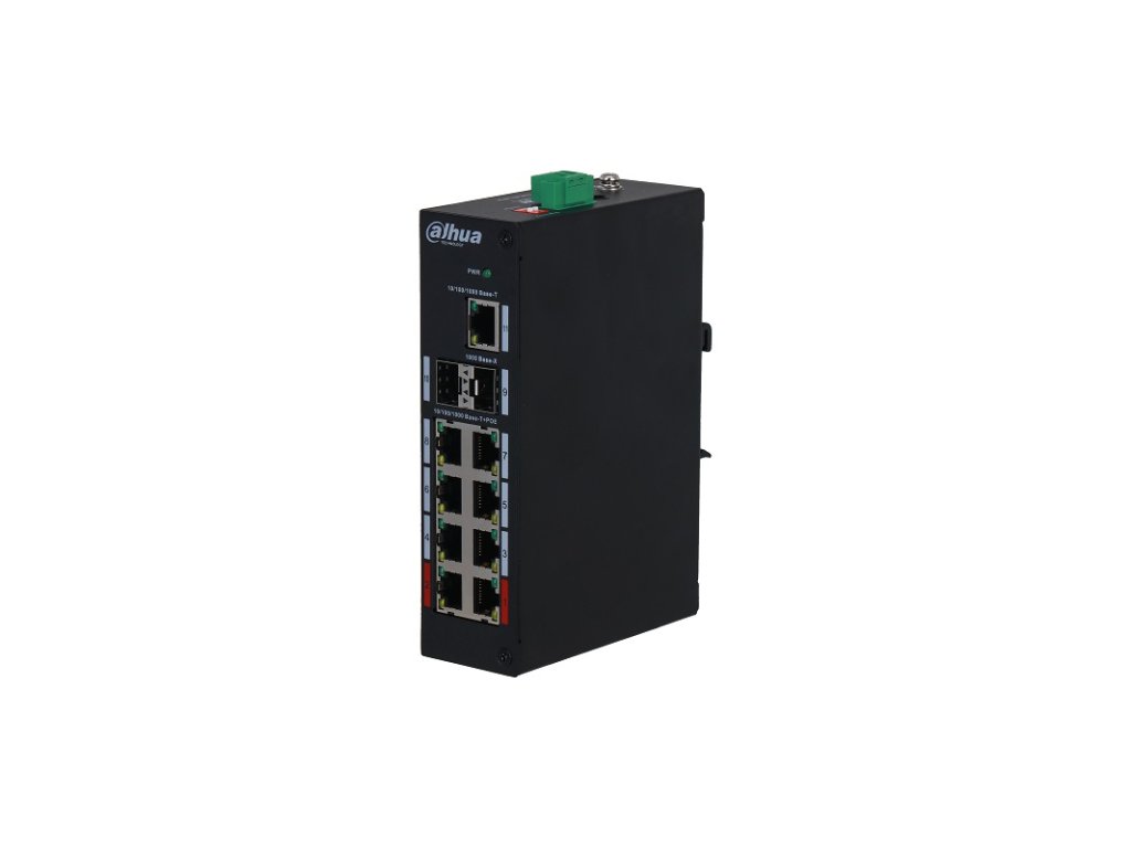 Dahua priemyselný nemanažovateľný switch 8x 1000 Mbps PoE + 2x SFP Gbit + 1x 10/100/1000 Mbps RJ-45, podpora PoE pre 8 portov, 2x PoE++ 90 W (port 1 + 2) a 6x PoE+, celkovo na všetky porty max. 120 W, PoE Watchdog, PoE do 250 m, ochrana pred prepätím 6 kV, napájanie 48–57 V DC (zdroj je súčasťou balenia), pracovná teplota od -30 °C do +65 °C, rozmery 150 × 110 × 42 mm, hmotnosť 0,67 kg, Switch nie je vhodný pre Avigilon kamery.