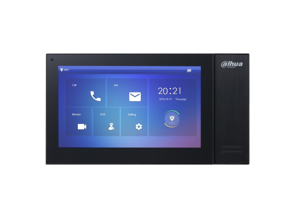 IP Dahua handsfree videomonitor, prevedenie čierny plast, 7" farebný dotykový LCD displej s rozlíšením 1024 x 600 px, H.264 kompresia, TCP/IP komunikácia, grafické menu, možnosť automatického vytvorenia obrázkov pri neprijatom hovore alebo videa pri zanechaní odkazu po vložení micro SD karty (je súčasťou monitora, vstavaná pamäť 8 GB), interkom v rámci viacerých monitorov v byte (max. 6 monitorov), pripojiteľnosť až 20 dverných jednotiek a externých CCTV Dahua IP kamier, podpora prenosu video hovoru / push notifikácie na Android a iOS smartfony cez internet (aplikácie DMSS), 1x RJ45 konektor pre pripojenie do siete, 6x NO kontakt pre pripojenie alarmových vstupov - funkcia EZS ústredne, 1x NO alarmový výstup, ovládanie 2 zámkov, prizvonenie od dverí, napájanie externým zdrojom 12 V DC / 2000 mA (zdroj nie je súčasťou balenia), alebo PoE 802.3af switchom, montáž na povrch, rozmery 222 x 120 x 22 mm, interiérové použitie
