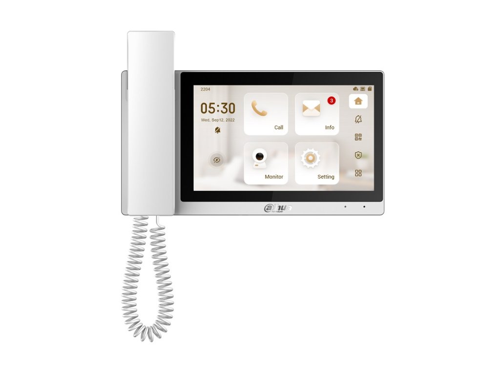 IP Dahua videomonitor, prevedenie biely plast, 7“ dotykový LCD displej s rozlíšením 1024 x 600 px, H.264 kompresia. TCP/IP komunikácia, Wi-fi, grafické prehľadné menu, možnosť vytvorenia obrázkov pri neprijatom hovore po vložení micro SD karty (nie je súčasťou balenia) max. podporovaná kapacita SD karty až 32 GB, možnosť pripojiť až 20 dverných jednotiek a 8 externých CCTV Dahua IP kamier, podpora video hovoru / push notifikácie na Android a iOS mobilné telefóny cez internet (aplikácia DMSS), 1x RJ-45 konektor pre pripojenie do siete, 6x NO kontakt pre pripojenie alarmových vstupov, 1x NO alarmový výstup, ovládanie 2 zámkov, možnosť prizvonenia od dverí, napájanie externým zdrojom 12V / 1000 mA (zdroj nie je súčasťou balenia), alebo PoE 802.3af switchom, ak používate externý zdroj a funkciu Wi‑Fi, použite zdroj 12 V DC / min. 2 A, montáž na povrch, rozmery 236,0 x 129,8 x 23,0 mm, interiérové použitie.