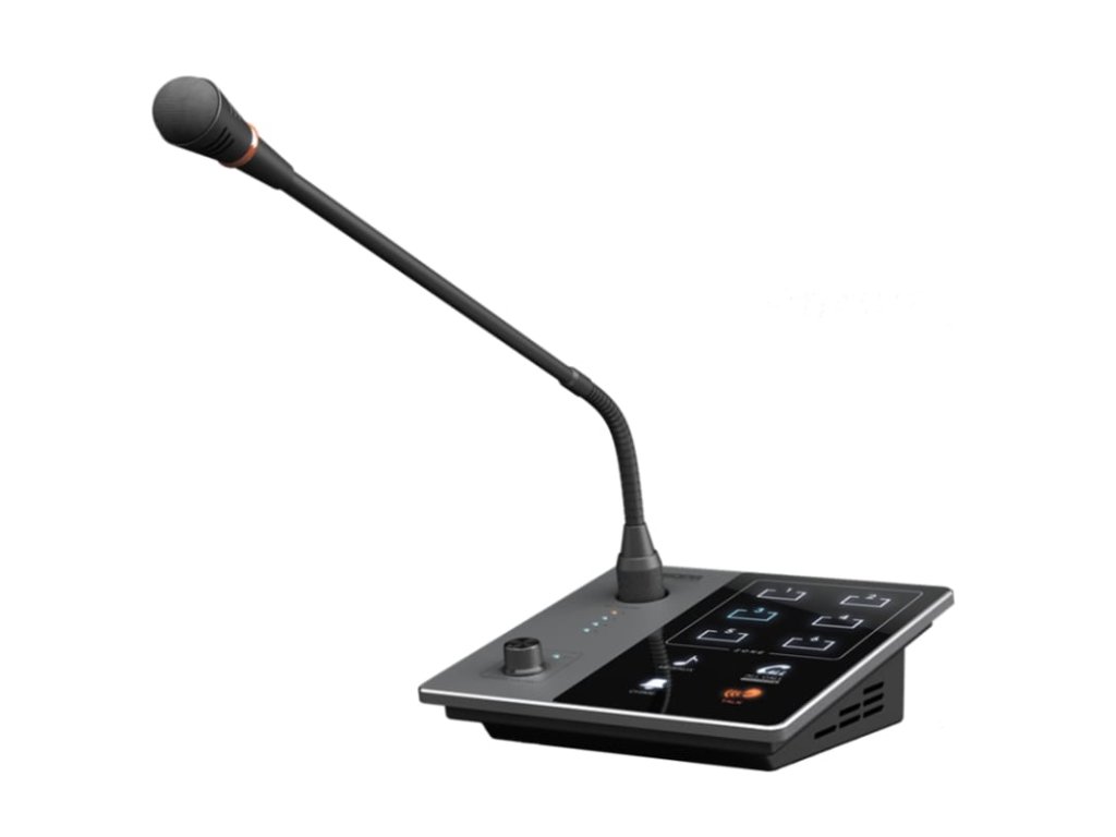 6 zónový ovládací stránkovací mikrofón, 2x RJ-45, určený pre ovládanie 6 zónového zosilňovača DMA6500U, obsahuje tlačidlá pre aktivovanie/deaktivovanie zóny, gong a tlačidlo TALK a ALL CALL. Napájanie zo zosilňovača, vzdialenosť max. 300 m, max 6 mikrofónov na jeden zosilňovač. Rozmery 172 x 53 x 160 mm (Š x V x H), farba čierna, hmotnosť 0,89 kg