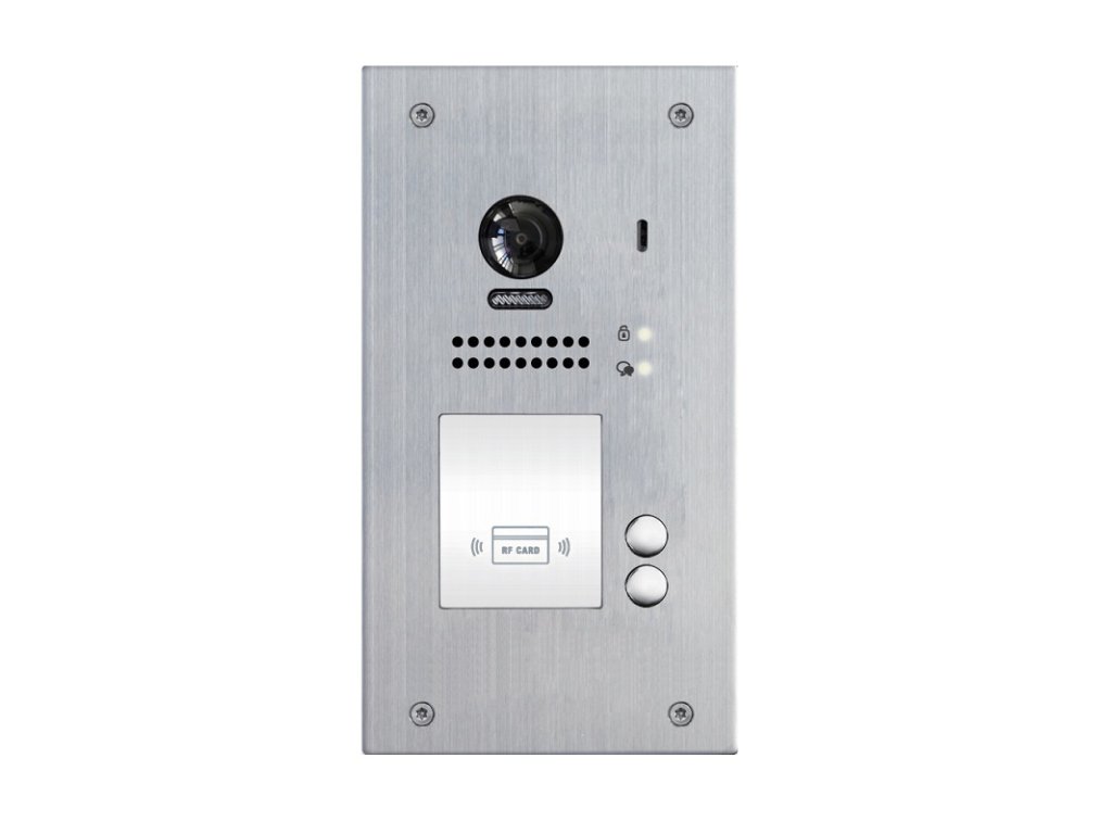 Dverná jednotka, video, 2 tlačidlá a RFID EM 125 kHz, antivandal, podsvietená menovka, prevedenie antikor, biele LED prisvetlenie snímaného priestoru, farebná kamera, uhol záberu 170°, krytie IP 43, 12 V DC / 300 mA alebo NO/NC relé ovládanie pre 1 zámok (možnosť pridať RLC modul pre 2. zámok), nastaviteľná dĺžka otvorenia 1-99 sekund, rozmery 119 x 220 x 52 mm, montáž pod omietku, kovová inšt. krabica súčasťou (rozmery krabice 104 x 208 x 43 mm), napájanie 24 V DC zo zbernice systému, dvojvodičový systém zapojenia – nepolarizovaný, odporúčaný netienený krútený pár, min. 2x 1 mm