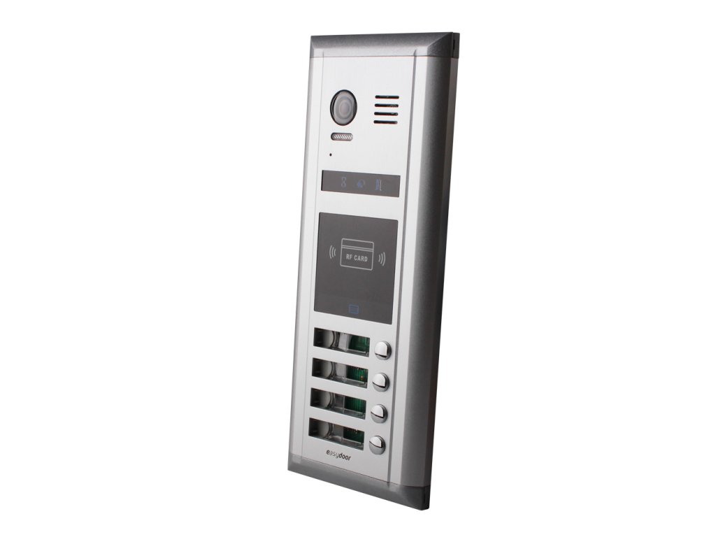 Dverná jednotka, video, 4 tlačidlá, antivandal, podsvietené menovky, indikácia stavu hovoru, povrchová úprava - hliník, biele LED prisvetlenie snímaného priestoru, farebná kamera, uhol záberu 105°, krytie IP 43, 12 V DC alebo NO/NC relé ovládanie pre 1 zámok, (možnosť pridať RLC modul pre 2. zámok), nastaviteľná dĺžka otvorenia 1–99 s, zabudovaná RFID čítačka kariet 125 kHz (kapacita 300 užívateľov, možnosť priradenia a editácie kľúčenky ku konkrétnemu bytu), možná záloha prístupových kariet a čipov, rozmery 124 x 308 x 65 mm, montáž pod omietku, inšt. krabica súčasťou, napájanie 24 V DC zo zbernice systému, dvojvodičový systém zapojenia - nepolarizovaný, odporúčaný netienený krútený pár, min. 2 x 1 mm