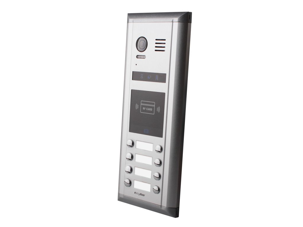 Dverná jednotka, video, 8 tlačidiel, antivandal, podsvietené menovky, indikácia stavu hovoru, povrchová úprava - hliník, biele LED prisvetlenie snímaného priestoru, farebná kamera, uhol záberu 105°, krytie IP 43, 12 V DC alebo NO/NC relé ovládanie pre 1 zámok, (možnosť pridať RLC modul pre 2. zámok), nastaviteľná dĺžka otvorenia 1–99 s, zabudovaná RFID čítačka kariet 125 kHz (kapacita 300 užívateľov, možnosť priradenia a editácie kľúčenky ku konkrétnemu bytu), možná záloha prístupových kariet a čipov, rozmery 124 x 308 x 65 mm, montáž pod omietku, inšt. krabica súčasťou, napájanie 24 V DC zo zbernice systému, dvojvodičový systém zapojenia - nepolarizovaný, odporúčaný netienený krútený pár, min. 2 x 1 mm, pre správnu funkčnosť systému je potrebné použiť napájací zdroj LRS-100-24