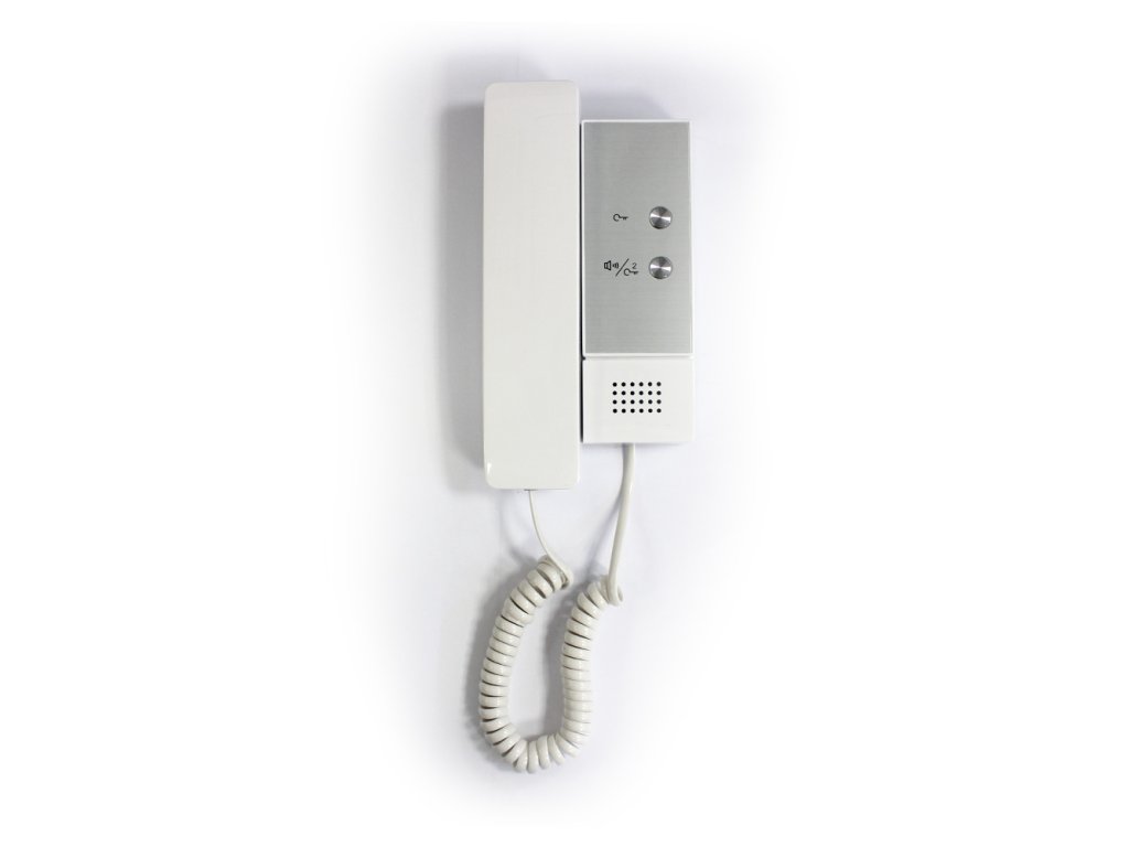 Easydoor audiotelefón so slúchadlom, prevedenie biely plast / hliník, bez displeja, mechanické tlačidlá, bez pamäte, skupinové volanie v rámci viacerých monitorov v byte, kontakt prídavného zvonenia od dverí bytu, nezávislé ovládanie 2 zámkov, adresácia DIP prepínačmi, napájanie 24 V DC zo zbernice systému (odporúčaný krútený pár, min. 2x 1 mm), montáž na povrch, rozmery 97 x 187 x 33 mm, interiérové použitie