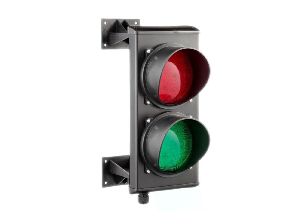 Semafor LED dvojkomorový (červená / zelená), priemer šošovky 124 mm, napájanie 8–45 V DC / 9–35 V AC, čierny, rozmery 160 x 395 x 280 mm, montáž na stenu, držiak súčasťou balenia