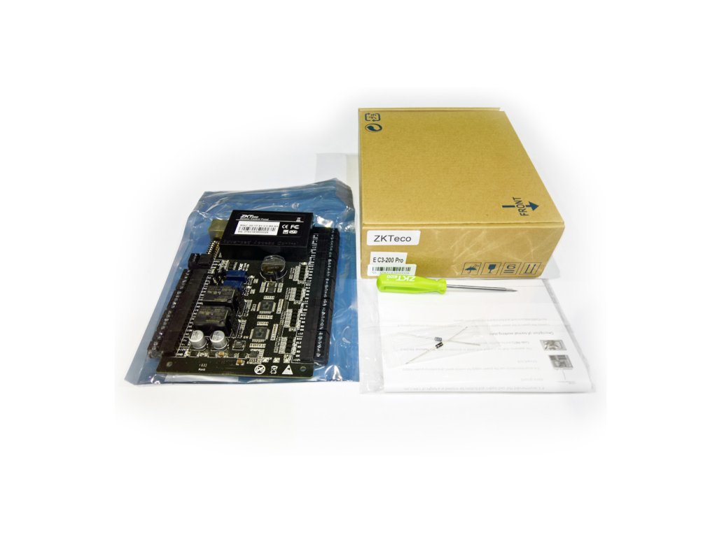 IP prístupový kontrolér, prevedenie plošný spoj, pripojenie 4x RFID čítačiek (Wiegand), ovládanie 2 dvier obojsmerne, kapacita 30 000 užívateľov, 100 000 udalostí, komunikácia s PC cez TCP/IP alebo RS485, LED signalizácia stavov, 2x NO/NC relé zámku (5A/30VDC), 2x relé vstup dverného kontaktu, 2x relé vstup odchodového tlačidla, 2x relé univerzálny AUX vstup, 2x relé univerzálny AUX výstup (2A/30VDC), napájanie 9,6 - 14,4 VDC, odber max. 1A/12VDC (zdroj nie je súčasťou), rozmery 160x106x20mm (vhodná inšt. krabica KR380 + napájací zdroj HDR-15-15), interiérové použitie, umiestnenie v chránenej zóne, podpora globálneho Anti-passbacku a linkovania medzi kontrolérmi, podľa počtu ovládaných dverí a pripojených modulov potrebná licencia pre profesionálny softvér ZKBioCVSecurity