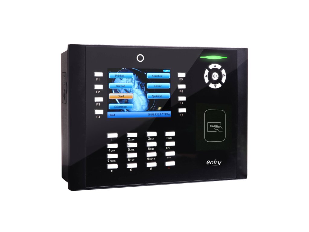 Dochádzkový terminál s duálnou RFID čítačkou (štandard EM4100, 125 kHZ, MIFARE 13,56 MHz, MIFARE DESFire EV1, MIFARE DESFire EV2) a kódovou klávesnicou, 10 000 kariet, 200 000 udalostí, 3,5" farebný grafický TFT displej, SK/CZ/EN jazyk, zvuková a LED signalizácia, plnohodnotné spracovanie dochádzky, 8 programovateľných tlačidiel prerušení, zabudovaná kamera pre zosnímanie zamestnanca, komunikácia s PC cez TCP/IP alebo RS-485 alebo RS-232. Funkcie prístupového terminálu: 1x NO/NC relé zámku, 1x NC vstupné relé dverného senzora, 1x NO výstupné relé alarmu, 1x NO vstupné relé odchodového tlačidla, 1x kontakt pre privolanie obsluhy, 1x Wiegand 26(34) bit vstup pre pripojenie externej RFID čítačky, 1x Wiegand 26(34) bit výstup pre pripojenie dochádzkového terminálu do Entry prístupového kontroléra, USB port pre prenos údajov a zmenu obrázka pozadia displeja, napájanie 12 V DC / 400 mA (zdroj je súčasťou). USB port pre prenos údajov a zmenu obrázka pozadia displeja, rozmery 225 x 165 x 50 mm, interiérové použitie. Možnosť pripojenia k terminálu cez webové prostredie pre jednoduchú HW konfiguráciu zariadenia.