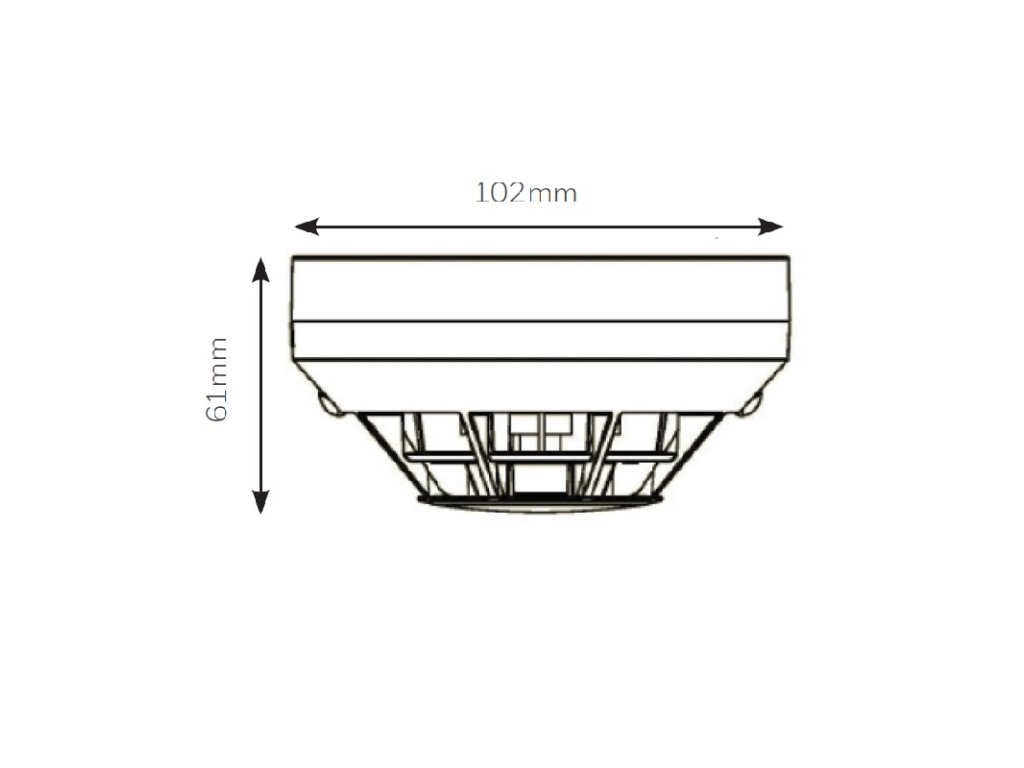 Teplotný hlásič termodiferenciálny, manuálne adresovateľný pomocou otočného prepínača, mikroprocesor pre potlačenie falošných poplachov, termodiferenciálny 10 °C / min. senzor A1R / 58 °C, umývateľný filter, 2x statusové LED, napájanie zo slučky / max. 300 μA, 1x výstup paralelné optickej signalizácie 24 V DC / 10 mA, maximálna výška inštalácia do 8 m, polomer pokrytia 5 m, rozmery 102 x 61 mm, biely, inštalácia do pätice (MI/B501AP/IV - nie je súčasťou), EN 54-5, EN 54-17