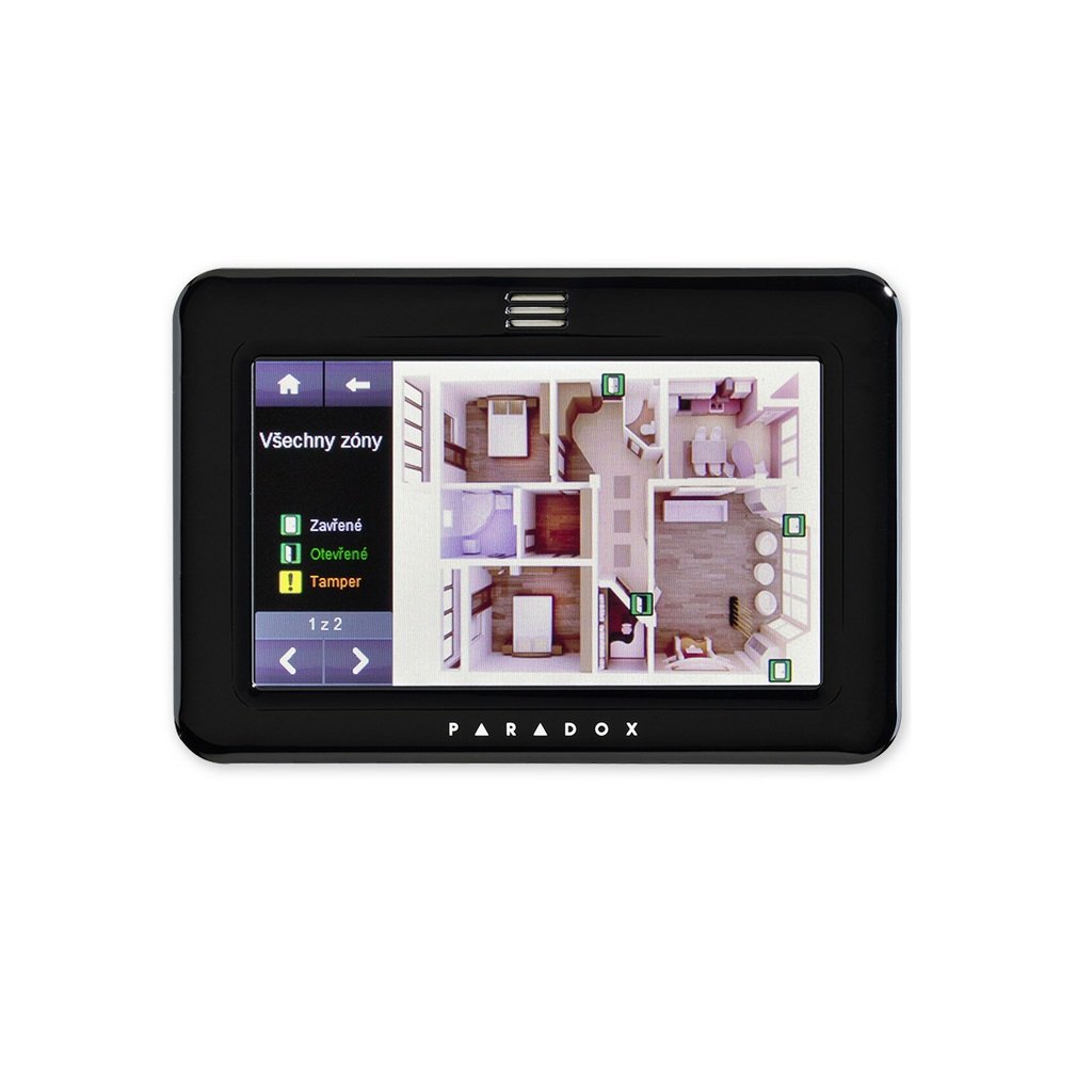 Dotyková ovládacia klávesnica čierna, pre rady SP / MG / EVO, grafický dotykový farebný LCD displej 6,4 x 11,2 cm, signalizácia všetkých stavov pomocou ikon a popisov, prehľadné a pohodlné ovládanie priamo na dotykovom LCD, zobrazenie pôdorysov objektu so zobrazením stavu snímačov, zobrazenie Annunciátor-prehľadné zobrazenie stavu podsystémov a zón, 1 kláves. zóna/vstup pre vonkajší teplomer, zobrazenie vnútornej + vonkajšej teploty (externé čidlo), užívateľské prispôsobenie vzhľadu, obrázkov a radu zvukov, napájanie 11–16 V = / 100 mA, rozmery 144 x 96 x 14 mm, microSD karta je súčasťou balenia.