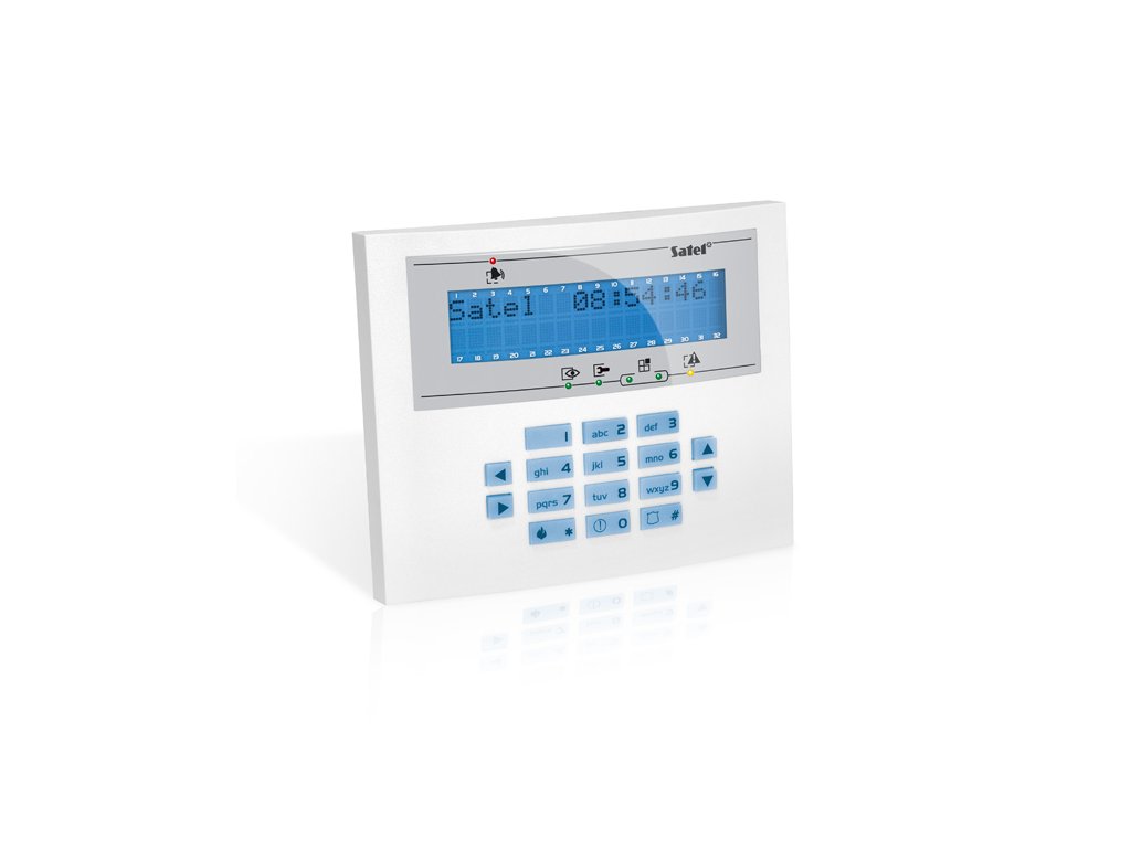 LCD klávesnica pre systém INTEGRA, modré podsvietenie, LED diódy indikujú stav systému, rýchle zapnutie režimu stráženia, klávesy pre napadnutie-požiar-pomoc, 2x programovateľný vstup, konektor RS-232 na pripojenie programu GUARDX, max. odber prúdu 156 mA, rozmery 145 x 115 x 26 mm