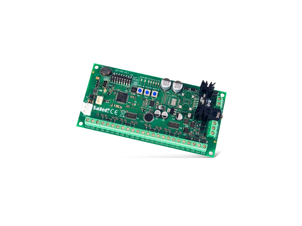 Modul hlasových správ, určený na prehrávanie hlasových správ pomocou ústredne, vhodný na oznamovanie výstražných a informačných správ alebo na uľahčenie ovládania obsluhy, max. 32 hlasových správ, prehrávanie správ pomocou ústredne INTEGRA alebo pomocou vstupov (iných externých zariadení), zabudovaný zosilňovač umožňujúci priame pripojenie reproduktora (max. 6 W, 8 Ω), linkový výstup uľahčujúci pripojenie na systém ozvučenia, max. prúdový odber 500 mA, rozmery 68 x 140 mm