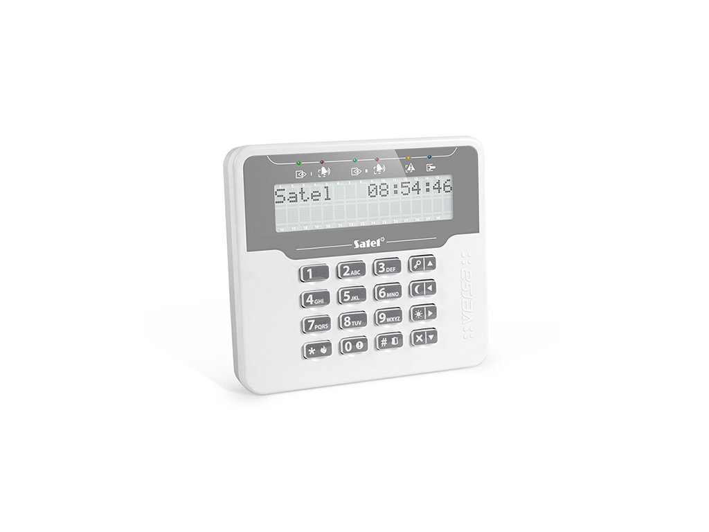 LCD klávesnica pre systém VERSA, veľký, ľahko čitateľný LCD displej, biele podsvietenie, LED diódy indikujú stav skupiny a systému, rýchle zapnutie režimu stráženia, klávesy pre napadnutie-požiar-pomoc, stupeň zabezpečenia Grade 2 podľa EN50131, max. odber prúdu 60 mA, rozmery 139 x 124 x 22 mm