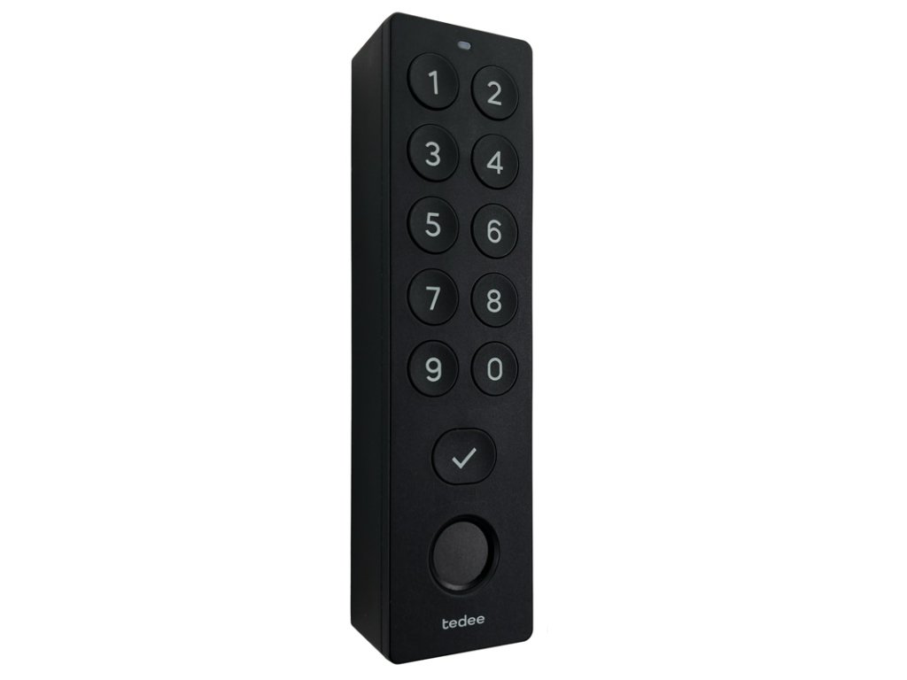 Tedee Keypad PRO je elegantné a inteligentné riešenie pre prístup bez kľúčov - s biometriou. Inštaluje sa vonku pri vchode a umožňuje vstup pomocou odtlačku prsta alebo PIN-kódu, bez potreby smartfónu, kľúčov či aplikácií. Kompatibilita so zámkami Tedee PRO alebo Tedee GO (vrátane GO2) a Tedee Bridge, čo rozširuje možnosti ovládania vstupu do domácností, kancelárií či prenajímaných priestorov. Napájanie zabezpečujú 4 batérie AAA s výdržou 12-14 mesiacov (batérie súčasťou balenia). Vonkajšie použitie IP65. Rozmery: 125 mm × 33 x 23,5 mm. Farba: Čierna